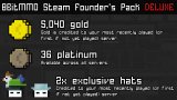 Get a jump-start into 8BitMMO and support development with this pack! Receive 5,040 gold and 36 platinum as well as two exclusive hats: the first is made of steam, the second made out of OTHER HATS.